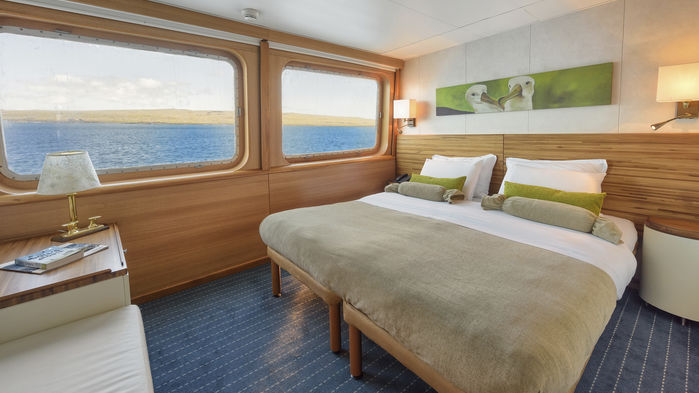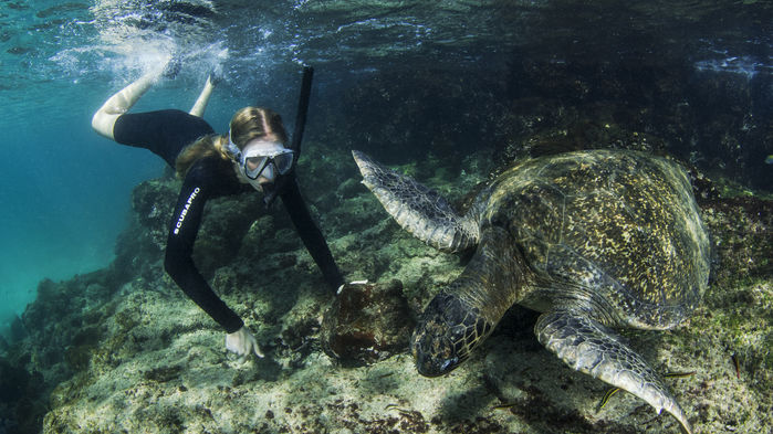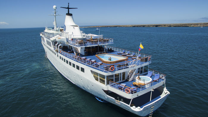 Transfer på morgonen från hotellet till inrikesflygplatsen i Quito för tre timmars flygresa till de unika Galápagosöarna. Ombordstigning på fartyget M/V Galapagos Legend som ligger för ankar vid ön Baltra. Ombord serveras lunch och kaptenen och besättningen hälsar välkommen. Avfärd och första anhalt blir den lilla korallön Mosquera. Här kan sjölejon ses slöa i den vita sanden men även vadarfåglar, häger, lavatrut och sulor kan observeras. Möjlighet till snorkling för den som önskar. Ofta kan haj, rocka och barracuda ses. 1,5 timmars promenad.
