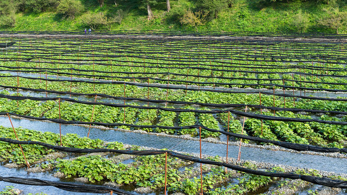 Efter vår tid i Takato fortsätter vi till Azumino. Här besöker vi Daio Wasabi Farm, en av de största wasabiodlingarna i Japan. Vi får en inblick i hur denna ikoniska japanska ingrediens odlas och används i matlagning. Wasabifältens gröna landskap med sina klara vattenflöden skapar en rogivande atmosfär, och gården erbjuder också möjligheten att prova wasabi-inspirerade produkter som wasabiglass eller lokala delikatesser.