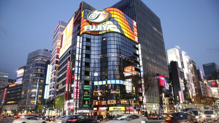 Under bussfärden mot dagens nästa destination passerar vi genom Ginza, ett område känt för sin moderna arkitektur och sina exklusiva butiker.