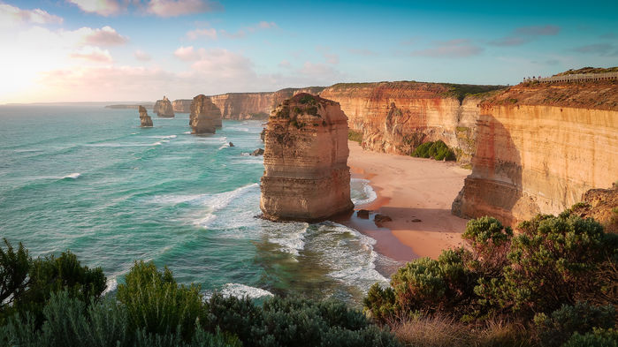 Tidig frukost och en kvarts promenad till Rendezvous Hotel där guide, buss och resten av medresenärerna samlas för en heldag utmed Great Ocean Road. Över Westgate Bridge, Australiens längsta bro och ned mot Surf Coast med dess förtrollande kuststäder och kraftfulla vågor. Stopp i Torquay för strandpromenad och morgonte. Den natursköna färden längs Great Ocean Road är en höjdpunkt i sig, med flera stopp och bland annat vid Great Ocean Road Memorial Arch vid Eastern View . I Kennett River blir det kort avstickare in i den ljuvligt doftande eukalyptuskogen för att spana efter koalorna i deras naturliga habitat. Lunchstopp i Apollo Bay med ett ytterligare fotostopp vid Cape Patton på vägen. Efter lunch leder Great Ocean Road bort från havet och in i bergen med ett stopp för att njuta av en promenad i den svala tempererade regnskogen. Sedan går färden vidare till den världsberömda Port Campbell National Park och dess ikoniska klippformationer, de Tolv Apostlarna. Ett stopp för middag eller fika görs på vägen tillbaka till Melbourne innan en fantastisk vy över den upplysta staden möter oss innan det är dags att kliva av efter en lång och vacker utflyktsdag.