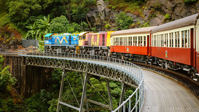 Dagens äventyr består av en tågupplevelse till den vackra lilla staden Kuranda. Kuranda Scenic Railway är pionjärhistoria från slutet av 1800-talet och bjuder på storslagna vyer över regnskog, raviner och vattenfall. Resan tar på en cirka 1 timme och 45 minuter och går genom världsarvsskyddad regnskog och över ravinen Barron Gorge. Själva Kuranda är en oerhört pittoresk plats med ett brett utbud av marknader, butiker och kaféer. Tåget tillbaka går på eftermiddagen och vi bokar resan i Gold Class med bekväma förbokade platser, snacks och något att dricka.