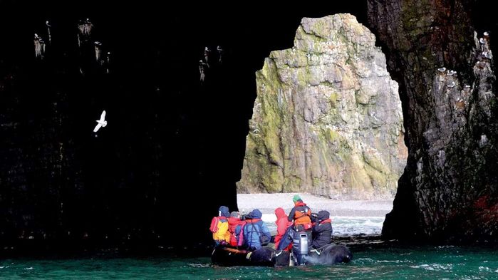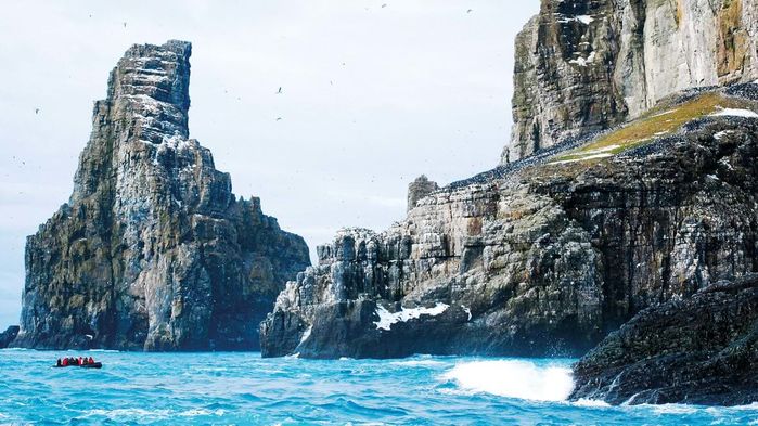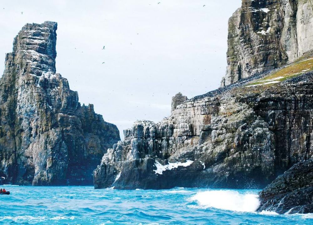 Dag 5. Björnön. Med våra gummibåtar utforskar vi denna fascinerande klippö mitt ute i Barents hav. Dess avlägsenhet gör att få fartyg per år har möjlighet att stanna till för ett besök. På de 400 meter lodräta klipporna hittar vi en av norra Atlantens största havsfågelkolonier. Här häckar tiotusentals sillgrisslor samt lunnefågel, tordmule, tobisgrissla, tretåig mås och vittrut. Om väder och vind är på vår sida, försöker vi oss såklart på en landstigning på denna sällan besökta ö. Vi fortsätter sedan vår färd in i de arktiska farvattnen. Vi seglar över natten och nästkommande eftermiddag siktar vi ögruppen Svalbard – en av världens mest storslagna vildmarker.