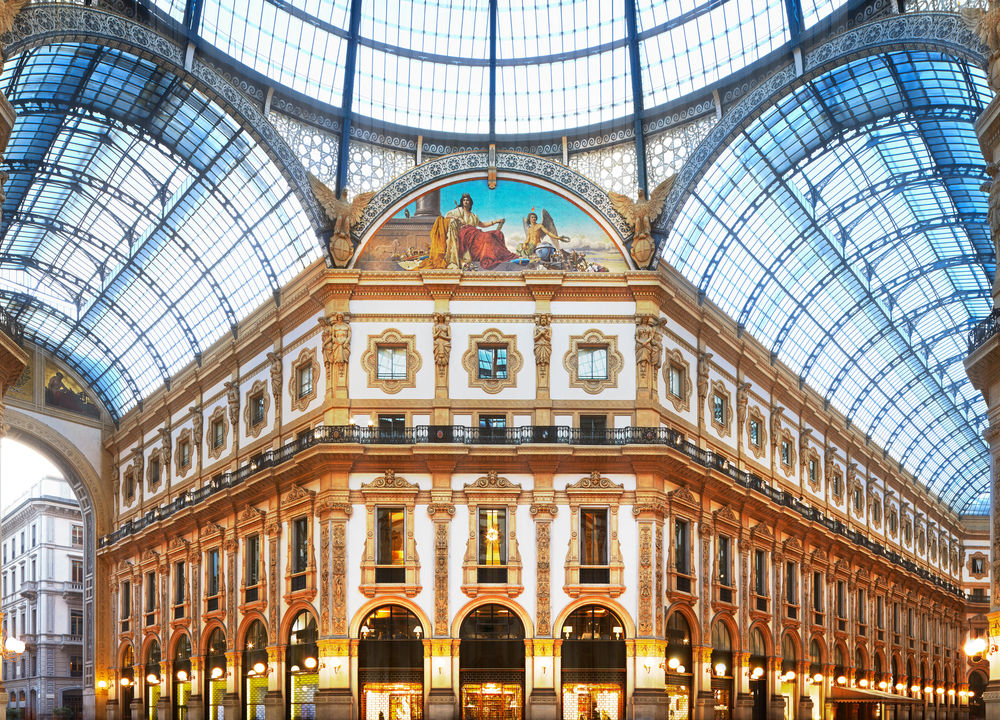 Den spektakulära gallerian Vittorio Emanuele II byggdes på 1800-talet och är ett av världens äldsta shoppingcenter. Gallerian består av två arkader som är fyra våningar höga och knyts samman av ett glastak. Arkaden är full av ljus med fantastiska marmordetaljer, målade fresker och kakelgolv. I de fyra mosaikerna som pryder det centrala golvet i gallerian kan man se Milanos, Florens, Roms och Turins vapensköldar. I gallerian finns de italienska modehusens lyxiga modebutiker och eleganta restauranger. Prada och Gucci är ett par av de många lyxmärken som har en butik i gallerian.