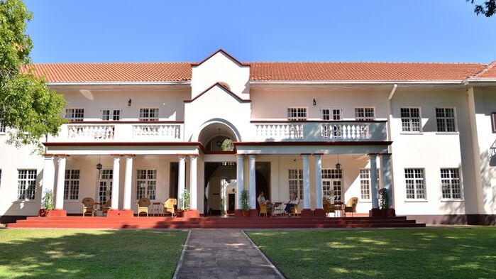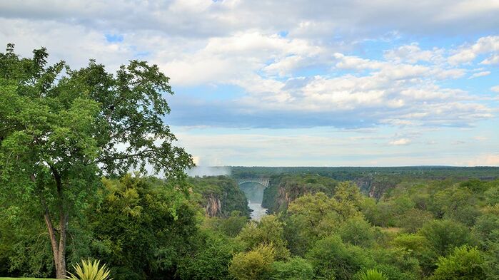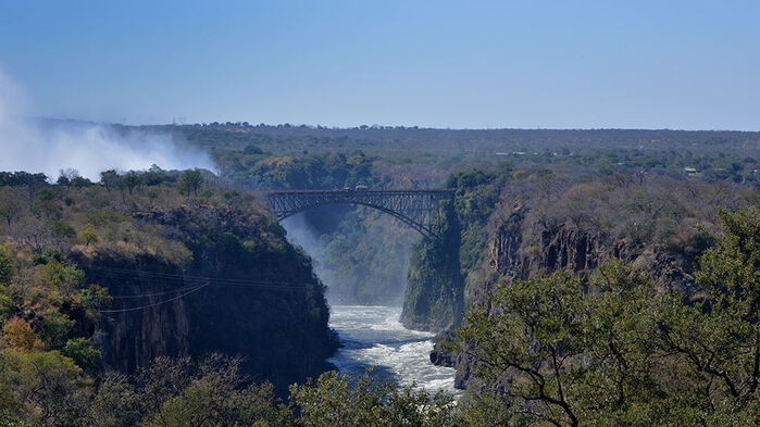 Upphämtning vid ankomst till Victoria Falls och privat transfer till hotellet, ikoniska Victoria Falls Hotel med utsikt mot Victoriafallen och bron över Zambezifloden till Zambia.