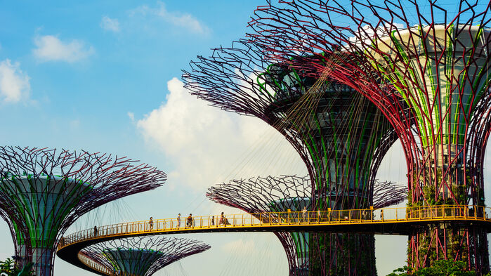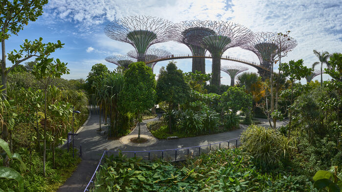Den mest ikoniska delen av trädgården är Supertree Grove, en samling av 18 gigantiska, trädliknande strukturer som sträcker sig mellan 25 och 50 meter över marken. Dessa vertikala träd är täckta av över 200 olika växtarter och förser parken med solenergi, regnvatteninsamling och naturlig ventilation. Promenera längs observatoriedäcket, OCBC Skyway uppe i trädkronorna och njut av den spektakulära utsikten. Varje kväll lyses Supertrees upp i en magisk ljusshow, Garden Rhapsody, som kombinerar färgsprakande ljus med musik.