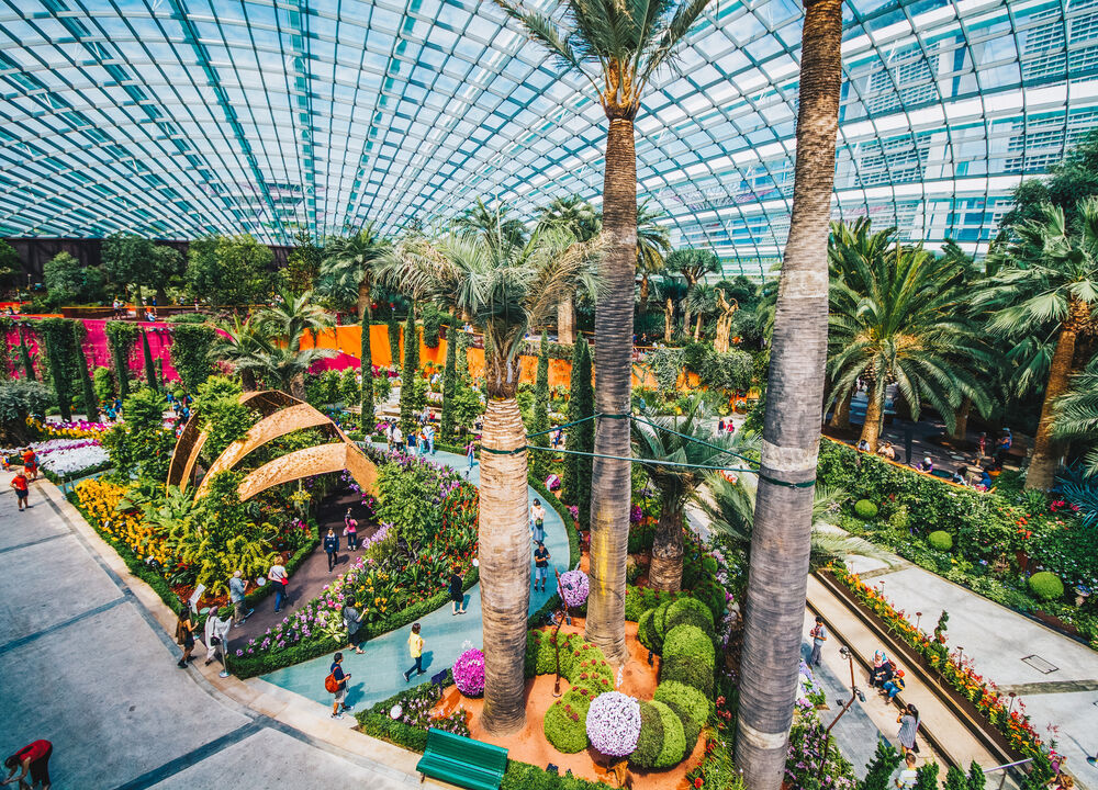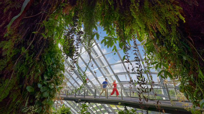 Cloud Forest är en av trädgårdens mest imponerande attraktioner. Inuti den stora glaskupolen möts besökare av ett 35 meter högt konstgjort vattenfall och ett svalt, dimmigt ekosystem fyllt med frodig grönska och exotiska växter från världens bergsregnskogar. Intill ligger Flower Dome, världens största växthus enligt Guinness rekordbok, där man kan vandra genom blomstrande landskap inspirerade av Medelhavet, Sydafrika och Kalifornien.