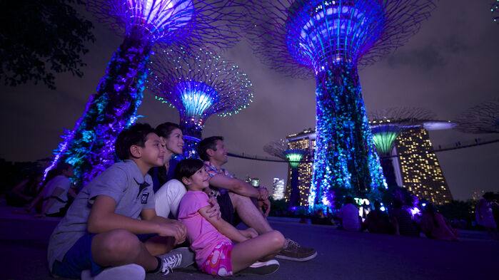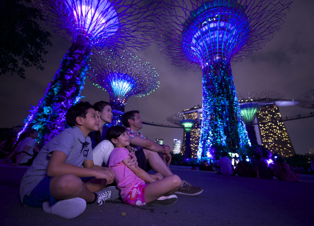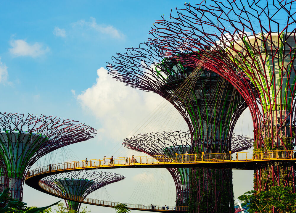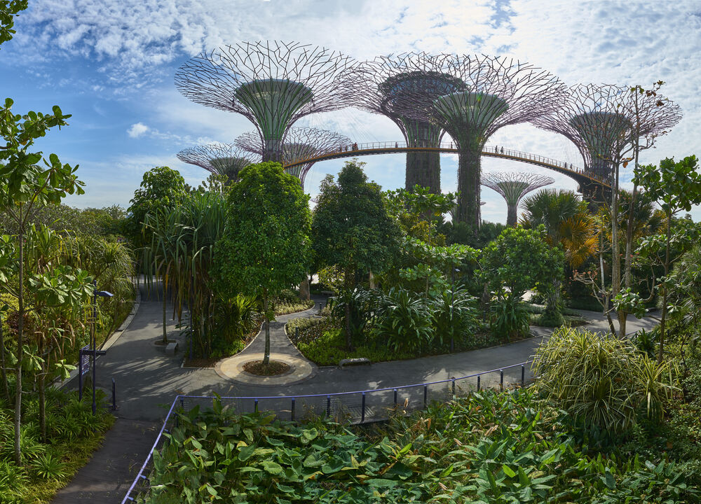 , en samling av 18 gigantiska, trädliknande strukturer som sträcker sig mellan 25 och 50 meter över marken. Dessa vertikala träd är täckta av över 200 olika växtarter och förser parken med solenergi, regnvatteninsamling och naturlig ventilation. Promenera längs observatoriedäcket, OCBC Skyway uppe i trädkronorna och njut av den spektakulära utsikten. Varje kväll lyses Supertrees upp i en magisk ljusshow, Garden Rhapsody, som kombinerar färgsprakande ljus med musik.