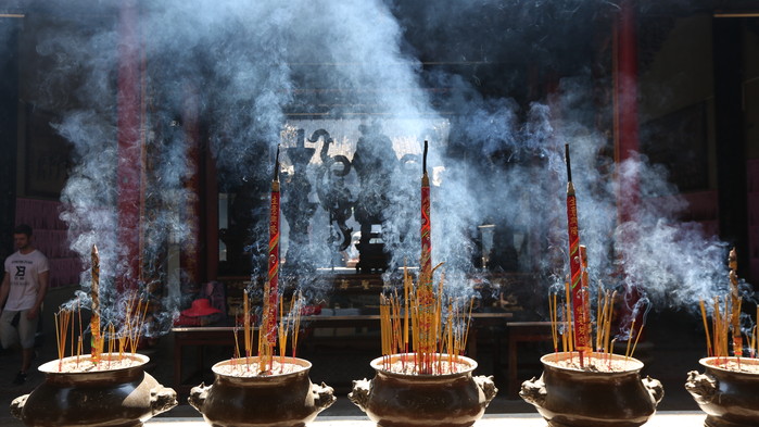 Resan fortsätter till Quang Phu Cau, en by känd för sin tillverkning av rökelse. Här möts vi av ett färgstarkt landskap där röda rökelsepinnar ligger utlagda på tork och skapar grafiska mönster. Vi ser hela processen, från kapning och färgning av bambupinnar till blandning av rökelsepasta, och får möjlighet att fotografera hantverkarna i arbete.